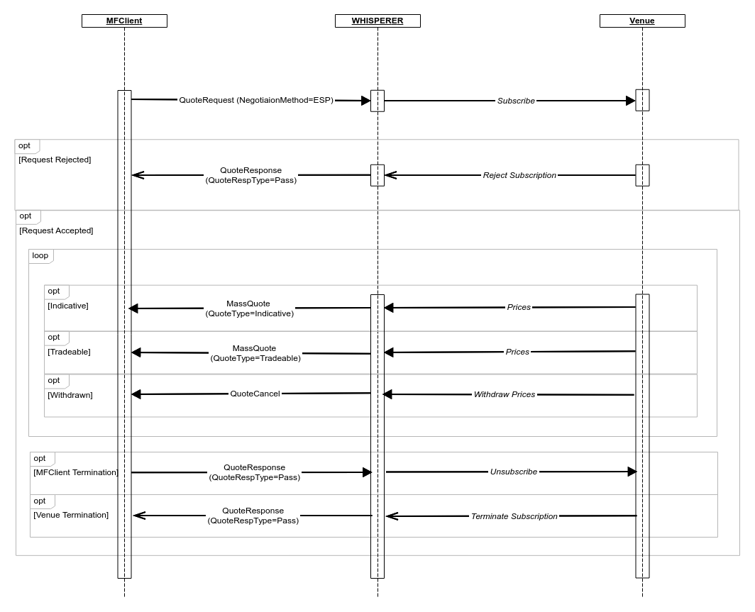 The messages flows documented here illustrate a standard "Last-Look" trading model. "Firm" trading is possible on some Venues and comprises standard MassQuote provision alongside receipt of ExecutionReport messages from the Venue notifying the maker of the fills.